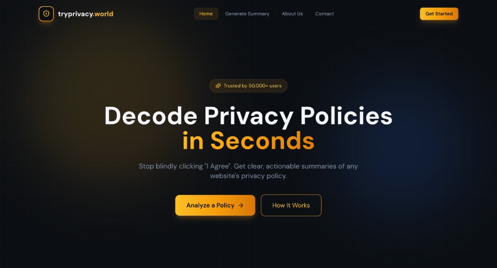 tryprivacy.world — AI-powered privacy policy summaries in plain language. Decode what you are agreeing to before you click “I Agree,” with GDPR and CCPA-aware analysis.